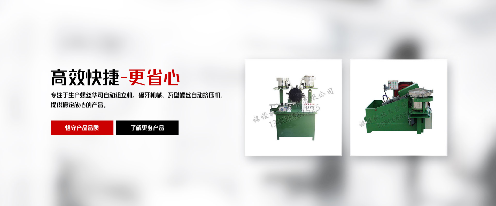 铭镗机械五金有限公司,位于浙南地区经济繁荣发达的乐清白象镇工业园区。公司拥有多年生产螺丝华司自动组立机及碾牙机械,瓦型螺丝自动挤压机,制造和生产经验。公司成立至今以先进的技术完善的科学管理、严格的产品检测及质量保证体系、和完善的售后服务体系;赢得广大用户的好评和信赖。
